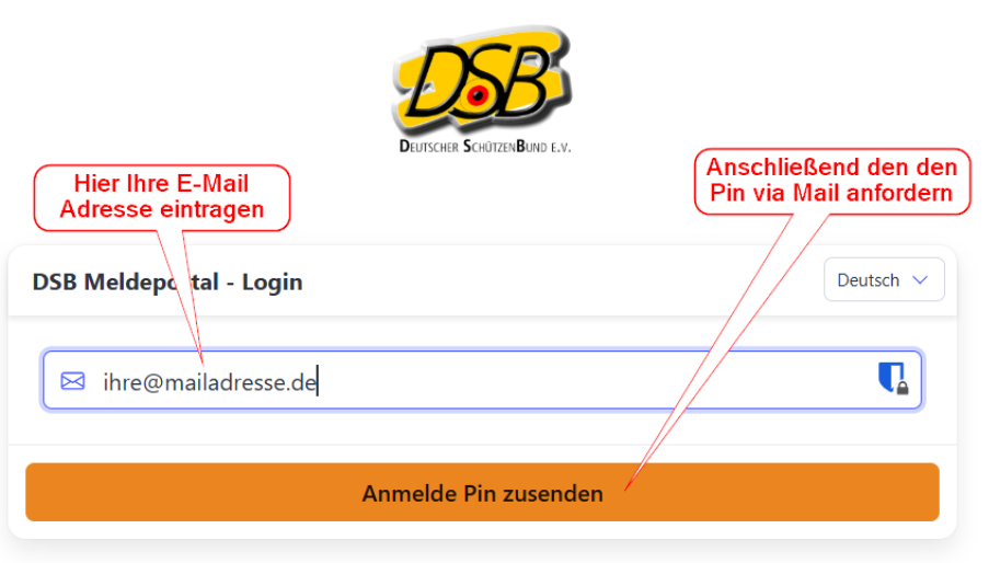 Hier tragen Sie Ihre E-Mail Adresse ein und fordern Sie Ihren Anmeldepin an. Dieser wird Ihnen als Mail zugesendet.